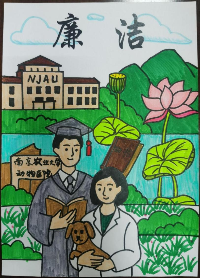 作品融合南農(nóng)校園文化、專業(yè)特色和中華傳統(tǒng)文化等元素,通過(guò)簡(jiǎn)潔的線條和溫暖的色調(diào)傳遞廉潔從業(yè)、守正篤實(shí)的精神內(nèi)涵。畫面中描繪學(xué)者與動(dòng)物醫(yī)生兩個(gè)廉潔從業(yè)人物形象;背景展現(xiàn)校園標(biāo)志性建筑、動(dòng)物醫(yī)院、荷花等意象。作品強(qiáng)調(diào)在教書育人、醫(yī)療救護(hù)等崗位上應(yīng)秉持公正誠(chéng)信、無(wú)私奉獻(xiàn)的職業(yè)操守,推動(dòng)廉潔文化在新時(shí)代背景下落地生根。