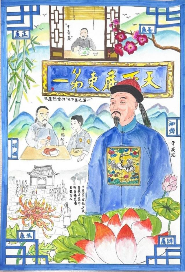 作品聚焦“天下廉吏第一”于成龍,通過(guò)三個(gè)經(jīng)典場(chǎng)景,呈現(xiàn)其清廉品格。畫面最上方,時(shí)任兩江總督于成龍,粗茶淡飯度日,獲“于青菜”美譽(yù);左中側(cè),與子分食半只臘鴨,當(dāng)年回鄉(xiāng)省親,鄉(xiāng)親籌錢作盤纏,他分文不收,歸途父子靠半只臘鴨支撐,也讓“半鴨知縣”聲名遠(yuǎn)揚(yáng);左下方,描繪其逝世后百姓“巷哭罷市,數(shù)萬(wàn)人持香楮悼念”的畫面;中間參考《于成龍》影視作品、本人畫像及網(wǎng)絡(luò)資料繪于成龍官服像;身后襯康熙帝“天下廉吏第一”褒獎(jiǎng)牌匾;畫面以梅花喻堅(jiān)韌、竹子表清雅、菊花彰淡泊、荷花顯清廉,借植物意象深化人物品質(zhì)。