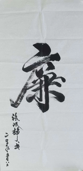 “廉”的本義是指廳堂的側(cè)邊,又因邊角方正有棱,故而引申為品行正直、清廉等含義。《說(shuō)文解字》解釋為“廉,仄也,從廣兼聲”?!秲x禮·鄉(xiāng)飲酒禮》載:“設(shè)席于堂廉,東上”,鄭玄注曰:“側(cè)邊曰‘廉’”。東漢劉熙《釋名·釋言語(yǔ)》載:“廉,斂也,自檢斂也?!焙髞?lái)便逐漸將“廉”引申為節(jié)儉、少拿、不貪取等含義。古籍中,常把品行端正、不貪不占之人稱為“廉夫”“廉士”。作品以水墨留白技法布局,將廉潔理念以書法之姿詮釋,讓這份傳承千年的價(jià)值準(zhǔn)則,在筆墨間延續(xù)、煥新。