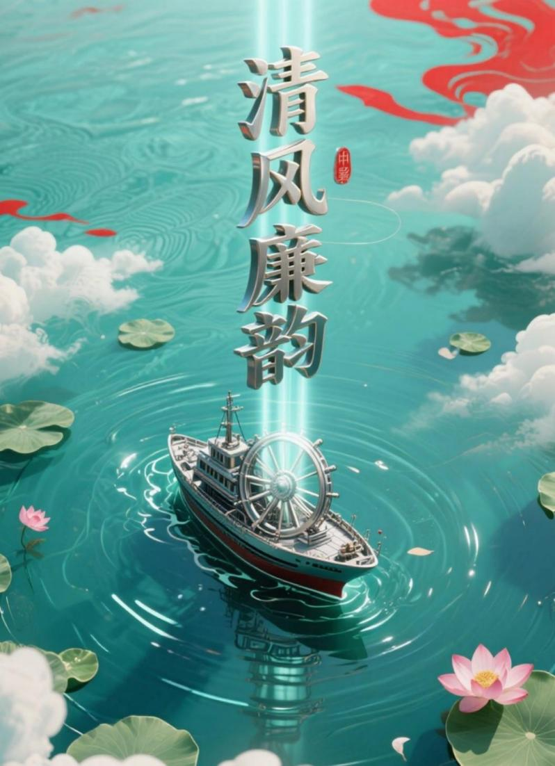 作品以“清風(fēng)廉韻”為主題,融合水墨江南意境與現(xiàn)代工業(yè)美學(xué)。碧波蕩漾的荷葉間,鋼鐵巨輪破浪而出,象征廉潔力量如巨輪前行般勢(shì)不可擋;光束穿透云層,映照立體金屬質(zhì)感的標(biāo)題,其間點(diǎn)綴的朱砂紅印,形成傳統(tǒng)與創(chuàng)新的視覺對(duì)話。畫面采用“天地構(gòu)圖”,江南水墨的含蓄雅致與現(xiàn)代工業(yè)的鏗鏘力量,剛?cè)岵?jì)地詮釋清正廉潔的時(shí)代精神,讓廉潔文化在傳統(tǒng)與創(chuàng)新的交織中煥發(fā)新生。