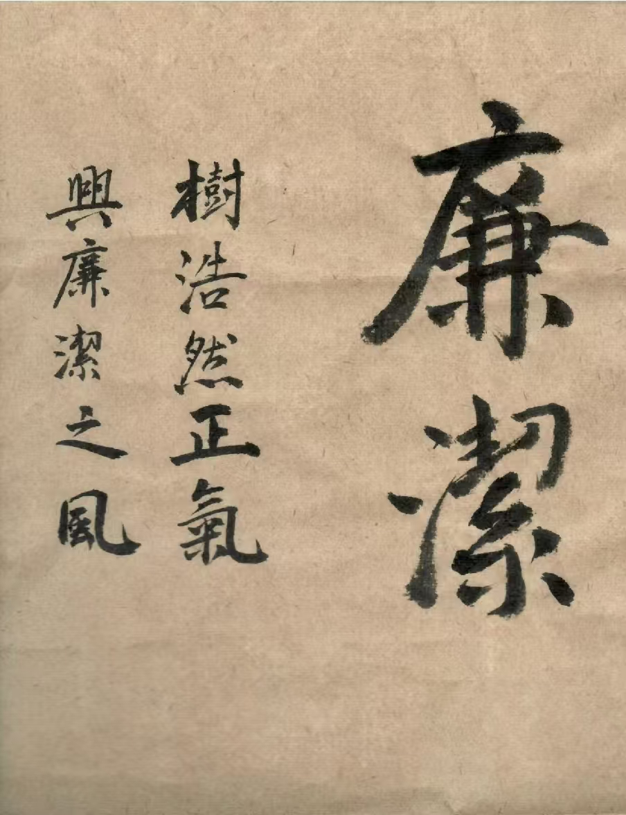 作品以傳統(tǒng)隸書為骨,取法漢碑之厚重。“樹浩然正氣”取法《張遷碑》;“興廉潔之風(fēng)”效《曹全碑》;“廉潔”二字以顏體楷法為基,形成視覺焦點(diǎn)。通過(guò)濃淡墨色變化與疏密布局,著力構(gòu)建“正氣存內(nèi),邪不可干”的空間意境,以藝術(shù)語(yǔ)言詮釋新時(shí)代反腐倡廉的時(shí)代精神。